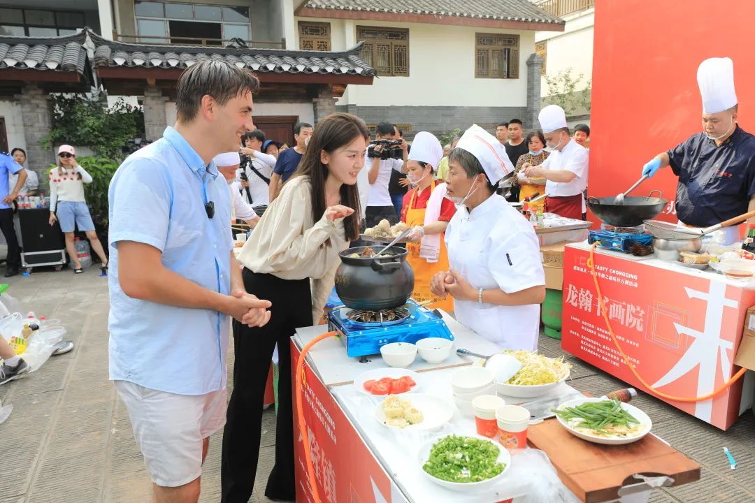 围观此次活动的群众中还有一群特殊的学徒,他们是来自美国、俄罗斯、牙买加、塞尔维亚等多个国家的留学生们。他们围在灶台锅边,仔细观察美食的制作过程,或不时询问第一次见的美食佐料,或刨根问底不解的制作技法,或帮忙捣碎青椒。现场色香味俱全的美食引得留学生们直呼:“渝北的美食各具绝技,渝北真是一个来了不想走的地方!”