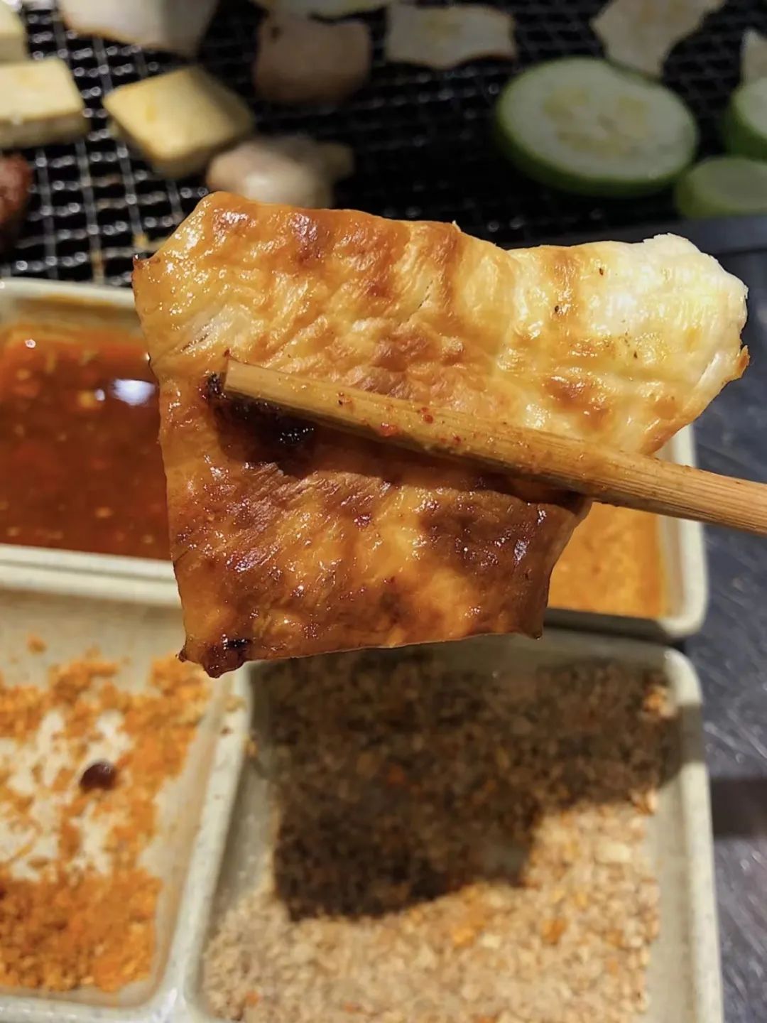 独家“烤苕皮”,苕皮烤得起泡微焦,里面夹着酸萝卜和小葱花,再刷上秘制辣油,吃着香辣弹韧,越嚼越香;“烤豆干”也是烤成了起泡状,厚厚的一口咬下去太绝了!