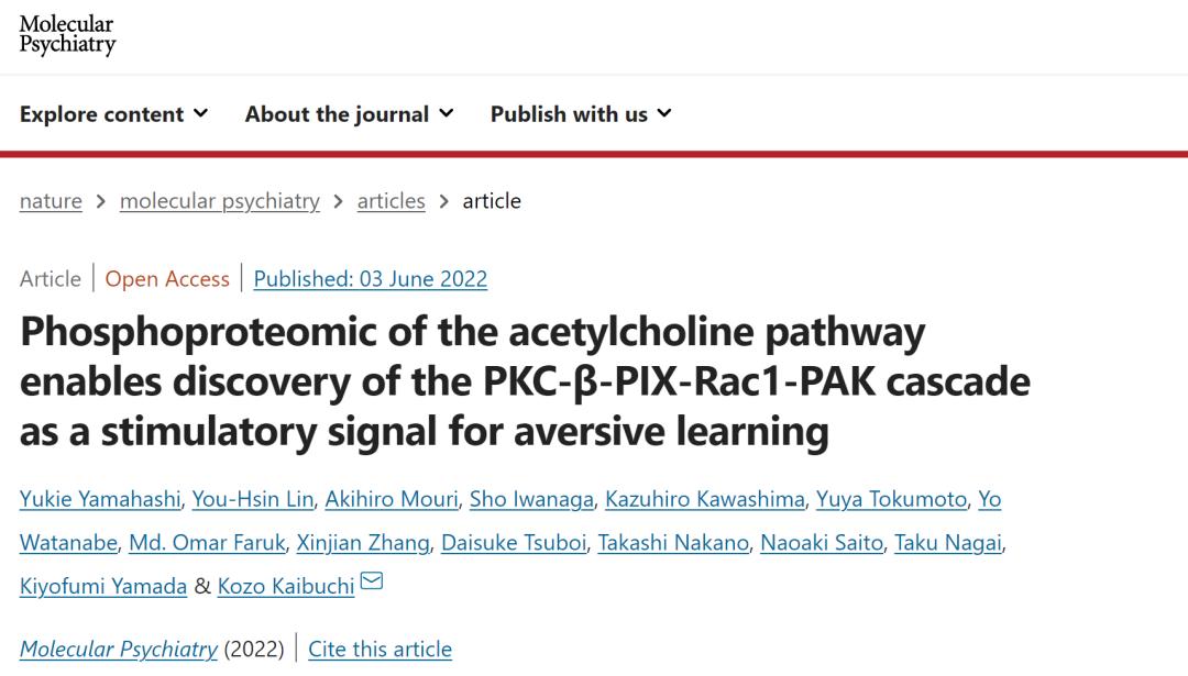 [1].Yamahashi, Y., Lin, YH., Mouri, A. et al. Phosphoproteomic of the acetylcholine pathway enables discovery of the PKC-β-PIX-Rac1-PAK cascade as a stimulatory signal for aversive learning. Mol Psychiatry (2022). https://doi.org/10.1038/s41380-022-01643-2