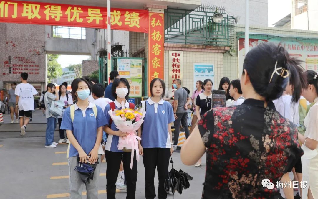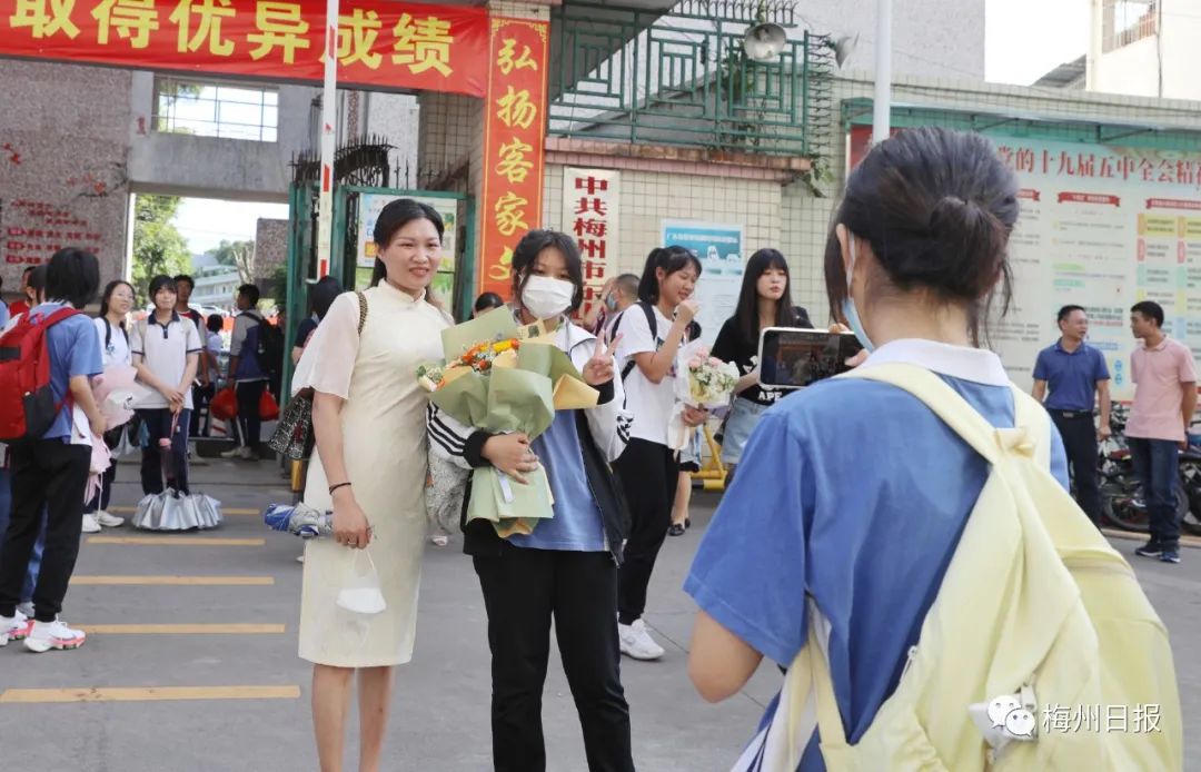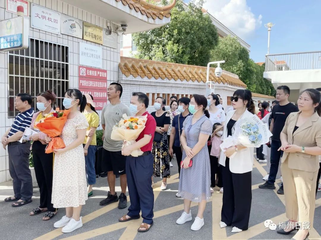梅州市东山学校考点,家长用鲜花迎接考生。