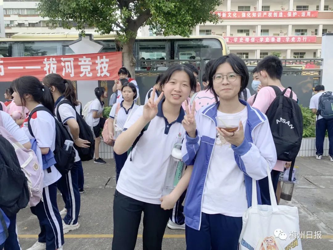 考生在梅县区宪梓中学门口合影留念。