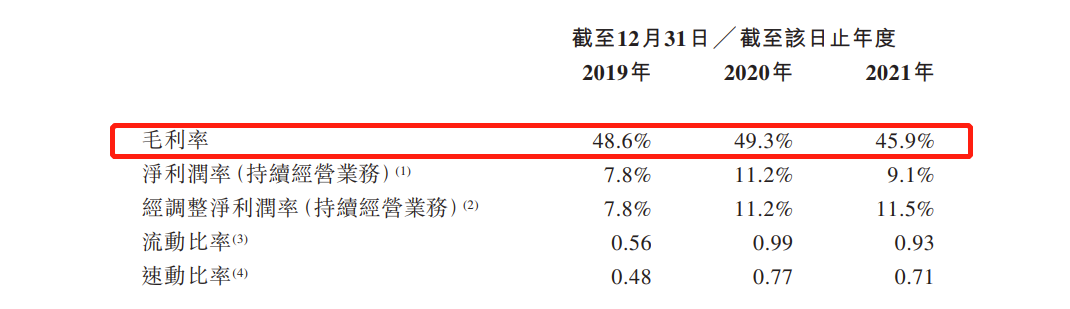 毛利率方面,2019-2021年,威高血液净化毛利率分别为48.6%、 49.3%、 45.9%,波动起伏,去年毛利率降至45.9%;同期间,净利润率分别为7.8%、 11.2%、 9.1%。经调整净利润率分别为7.8%、 11.2%、 11.5%。此外,流动比率由截至2019年的0.56上升至截至2020年的0.99,速动比率由截至2019年的0.48上升至截至2020年的0.77。