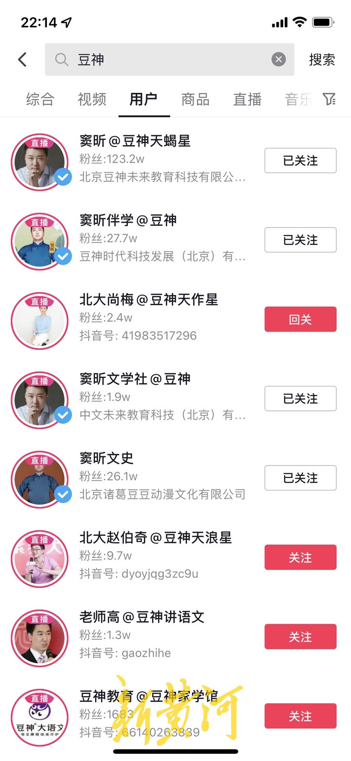 27日23:00,拥有123.5万粉丝的抖音用户“窦昕@豆神天蝎星”正在直播,实时在线观看人数160人,这时北京豆神未来教育科技有限公司官方账号。“豆粉伴读”“豆粉伴学”“豆粉文史”“老师高@豆神讲语文”等豆神教育旗下的账号都在直播,实时在线观看人数分别为70人、50人、9人和10人。