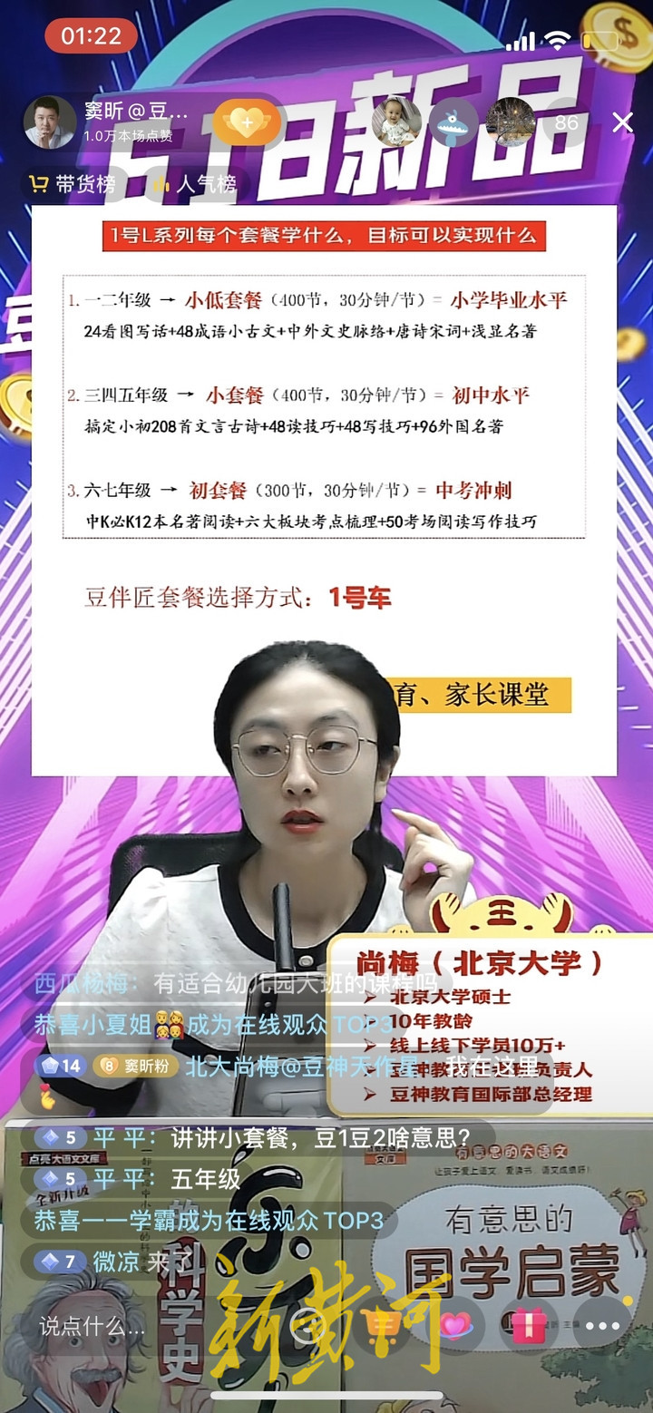 同一时间进入豆神教育的不同直播间,10多名主播推介的均为同一款商品,即“成人汉语学习L系列”。一名主播解释,该商品实际内容是“语和文”课程,下载豆伴匠软件,自学文史知识及读写技巧录播课程。根据家长在直播间留言的孩子年级,主播推荐家长去拍下该商品的不同套餐,并介绍不同套餐的具体授课内容。记者注意到,该商品的产品参数显示,适用人群为“成人”。