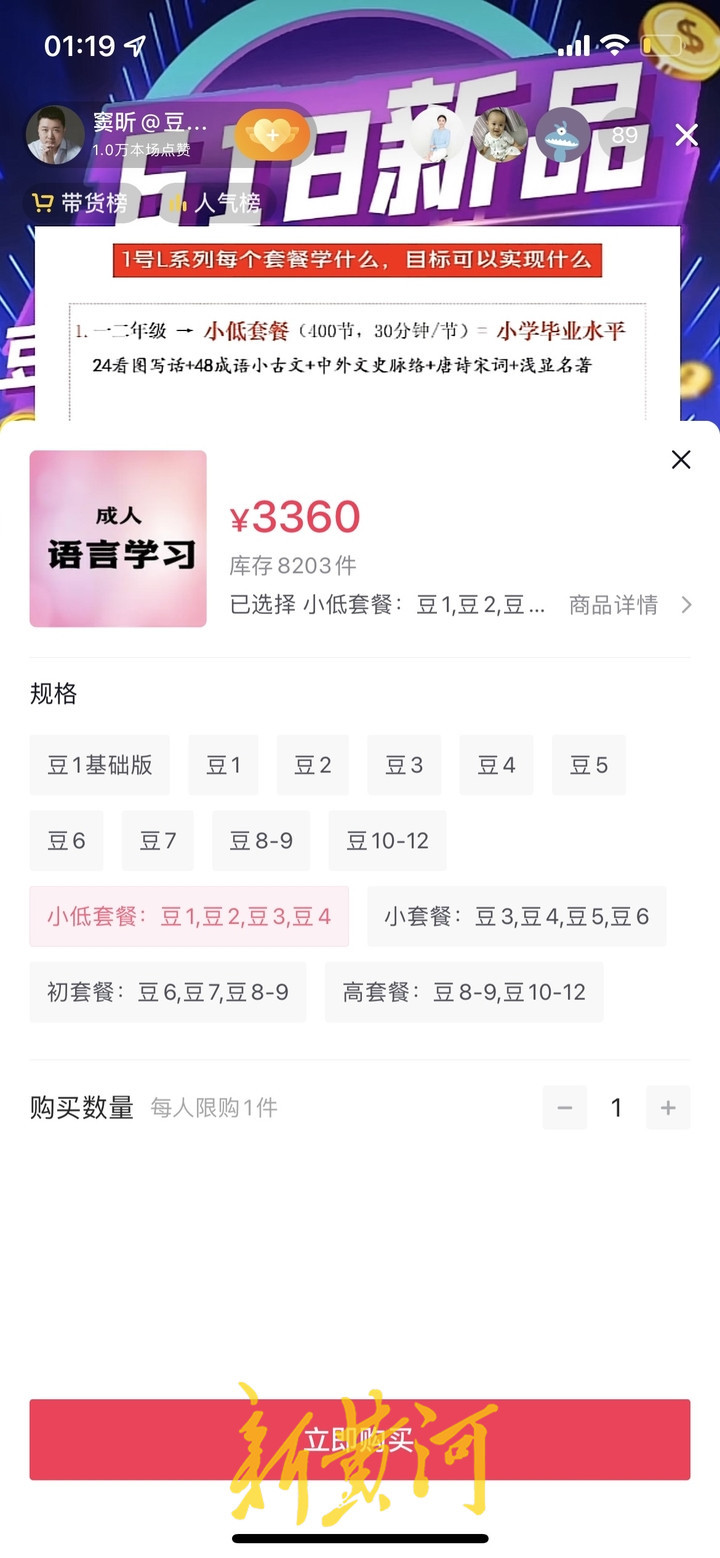 豆神教育直播业务的经营模式也备受关注。连日来,新黄河记者观看豆神教育的多场直播,发现部分直播场次在线观看人数仅数十人,甚至个位数,且销售的产品较为单一,“语和文”的课程被标注为成人语言课程。