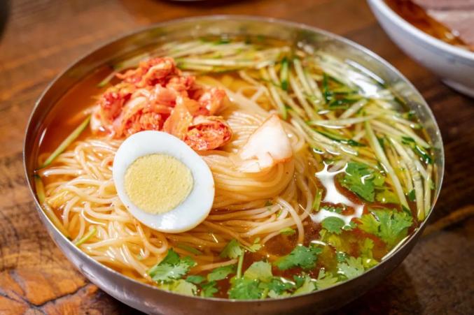延吉当地的水冷面多是用荞麦面,冷面上的菜色也很丰盛,蛋皮丝、卤牛肉、辣白菜、黄瓜丝、水煮蛋,隆重到看不见面条。