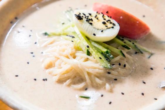 除了传统冷面,在这里还能吃到朝鲜族的另一种特色——豆浆冷面。煮熟、过凉的冷面盘在碗里,用冰豆浆做面汤,配上黄瓜丝、西红柿、鸡蛋,再撒上炒熟、碾碎的白芝麻。