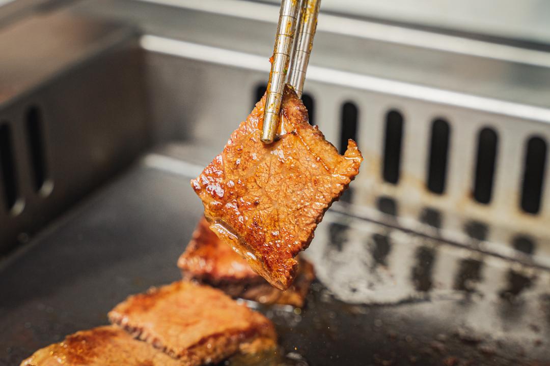 他家的烤肉都是放在一块大铁板上,铁板烧的滚烫,放上肉滋滋啦啦直响。