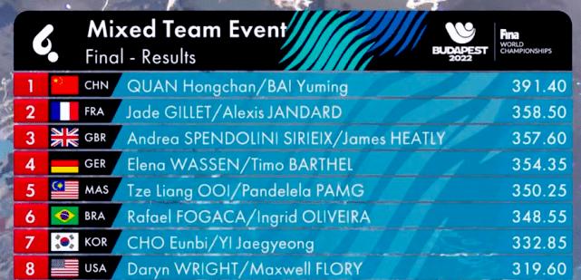 ▶中国跳水迎来世锦赛100金!全红婵白钰鸣混合全能夺冠 昨日,2022国际泳联世锦赛结束了混合全能跳水决赛的争夺。中国队两位小将全红婵和白钰鸣以382分的高分夺得冠军,为中国跳水梦之队摘得世锦赛参赛历史上的第100枚金牌。