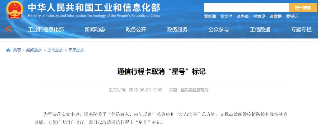 今天(6月29日)15时,工信部官网发布消息宣布:通信行程卡取消“星号”标记!