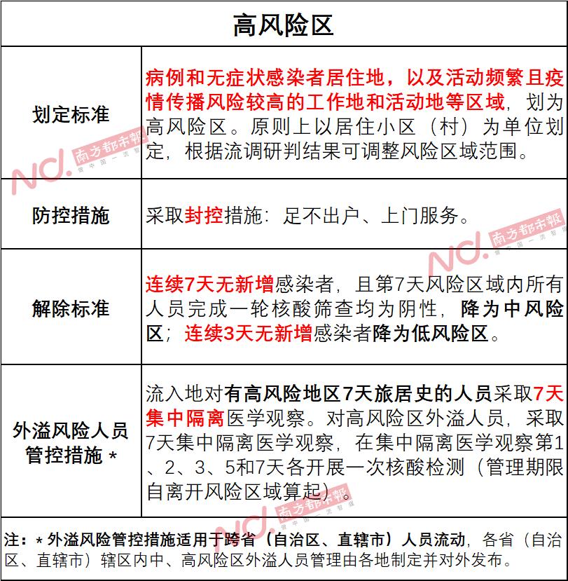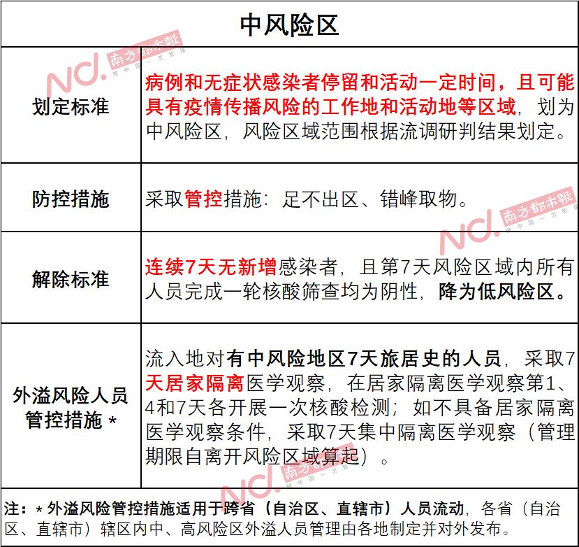 高风险区连续7天无新增感染者可以降为中风险区,之后如果连续3天没有新增感染者,可降为低风险区。对跨区域外溢的高风险区人员,采取7天的集中隔离医学观察。在集中隔离的第1、2、3、5、7天各开展一次核酸检测。