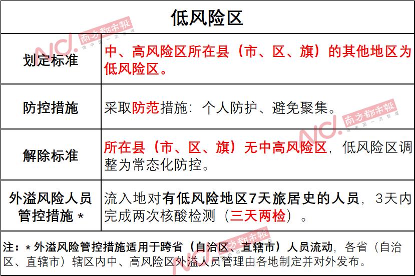 方案明确,中高风险区所在的县(市、区、旗)的其他地区划定为低风险区。低风险区采取“个人防护、避免聚集”的防范措施。低风险区域人员离开所在的地区或城市,应持48小时核酸检测阴性证明。