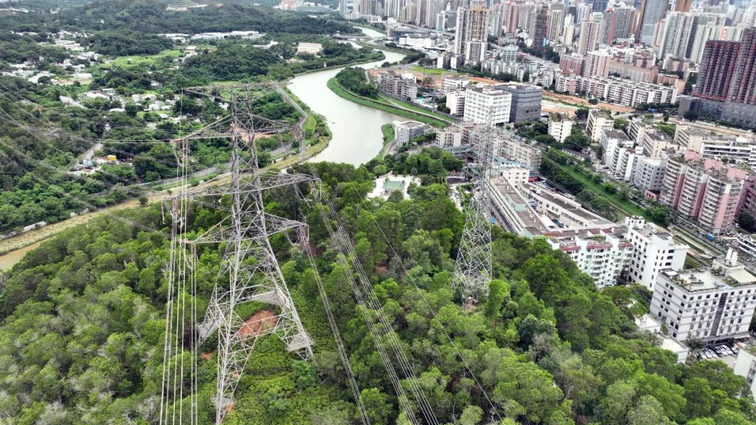 ▲位于深圳河边的深港交界处,由深圳送电香港的400千伏输电线路跨河而过。李志杰 黄海鹏 摄