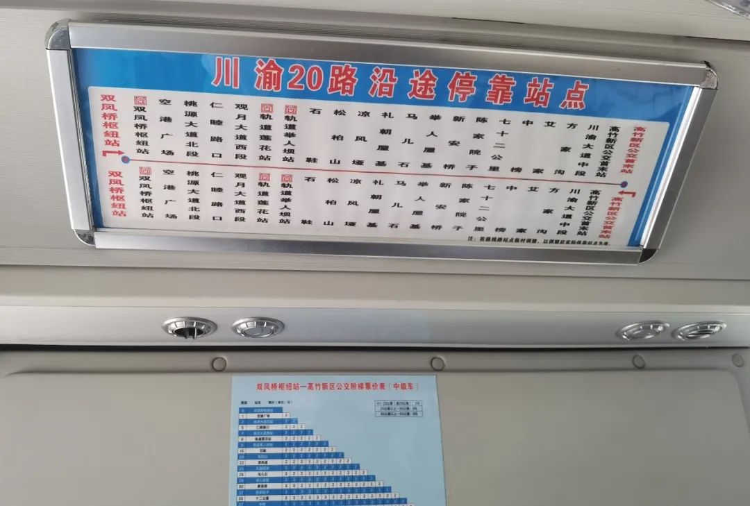 据介绍,此次开通的“川渝20路”省际公交路线首末站为川渝高竹新区至渝北双凤桥枢纽站,全长46公里。沿途途经高竹新区公交首末站、川渝大道、210国道、南北大道、港通大道、空港大道、跳蹬河大桥、观月大桥、桃源大道、双凤桥枢纽站等地点,开收班时间为6:00——18:30。此路公交对重庆公交集团的软硬件进行了优化升级,实行跨省域一卡互通、政策互认、系统互联,同标准执行重庆中心城区相关票价减免政策。