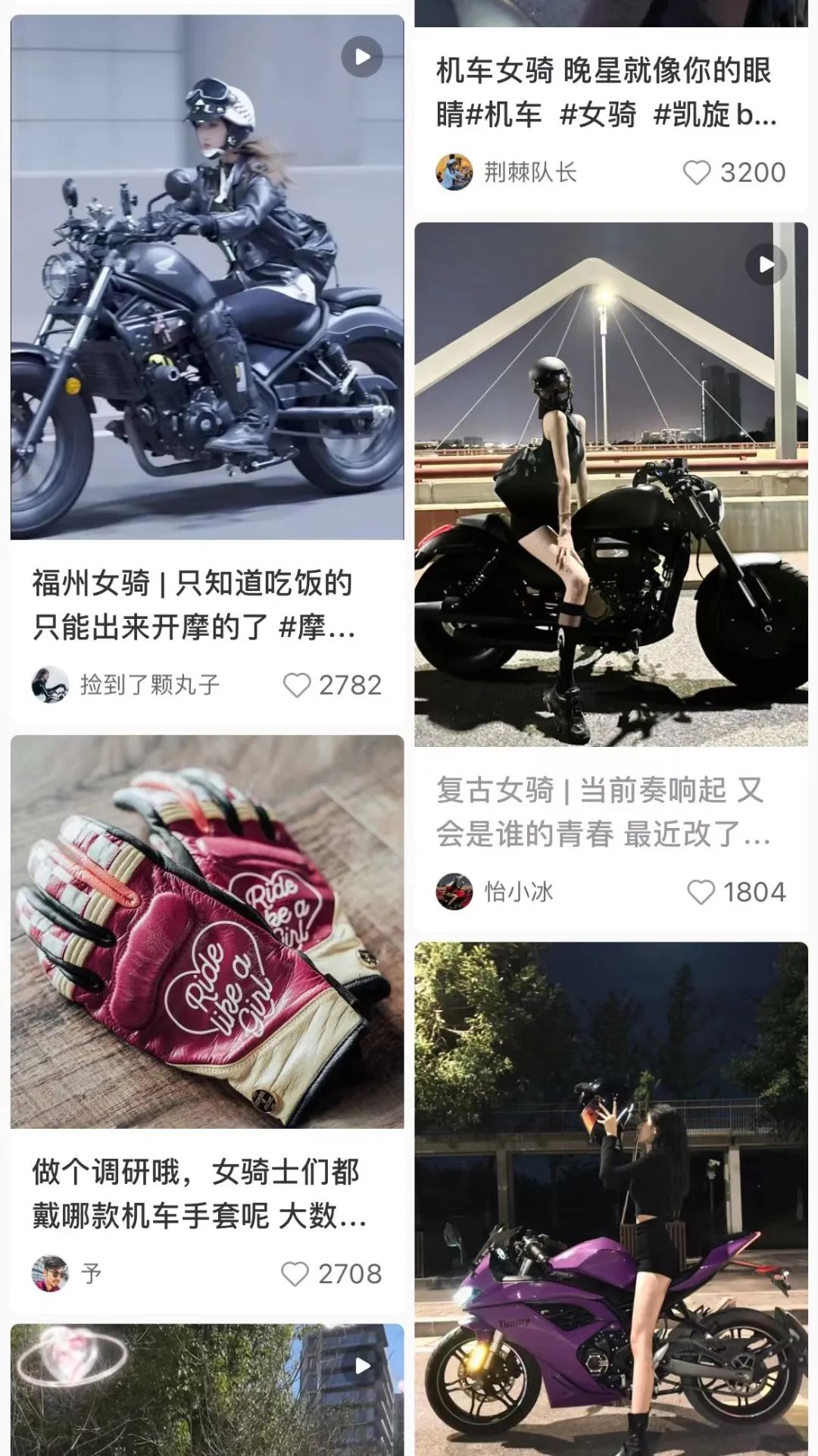 李彤观察到,有的博主露胳膊露腿骑摩托车,没有向粉丝和网友宣传骑行穿护具的重要性,新手可能会照着学。“比如穿个吊带短裤摔着了,500斤的车砸身上就很危险。看着穿着很漂亮,其实这些不戴护具的女骑手穿的都是‘血肉模糊’套装。”