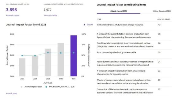 科睿唯安 (Clarivate Analytics) 发布了2021年度《期刊引证报告》(Journal Citation Reports)。中国化工学会会刊Chinese Journal of Chemical Engineering (CJChE) ,即《中国化学工程学报(英)》的影响因子继续保持上升趋势,达到3.898 ,涨幅22.9%,总被引频次8269,再创历史新高,工程/化学类期刊排名63/143(Q2区)。