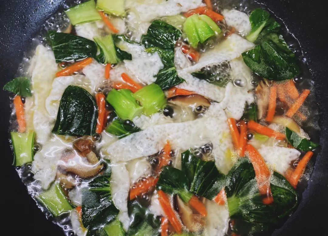 再用刀刃切成二指骈宽的条状,下沸汤煮烫,搁几张上海青和胡萝卜丝,一些咸榨菜,细盐调味,盛到碗中,即是一份正宗的温州敲鱼汤了。用那鲜美的汤水来拌,呼呼就能造下一碗白饭了。