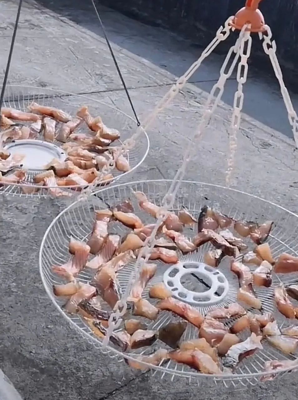 这个时候我妈一般还要取来家里前些年废弃的电扇外罩,将那些腌渍好的鱼肉摆上头,拿到阳台处摆好了。昼间由得日头暴晒,大风刮过,入夜了再打开几把伞来遮挡夜露,就这样日以复夜,夜以复日的一段时间,看着鱼身由最初的软糯到渐渐风干梆硬。要吃的时候,上锅一蒸就好了。