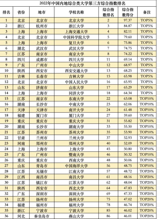 大学第三方指数呈现的是大学被各类第三方评价机构进行评价排名的综合情况,反映各类第三方评价同时作用于同一所大学后的综合结果。其中,中国内地指数,是反映内地大学被内地主要第三方评价机构评价的总体情况。