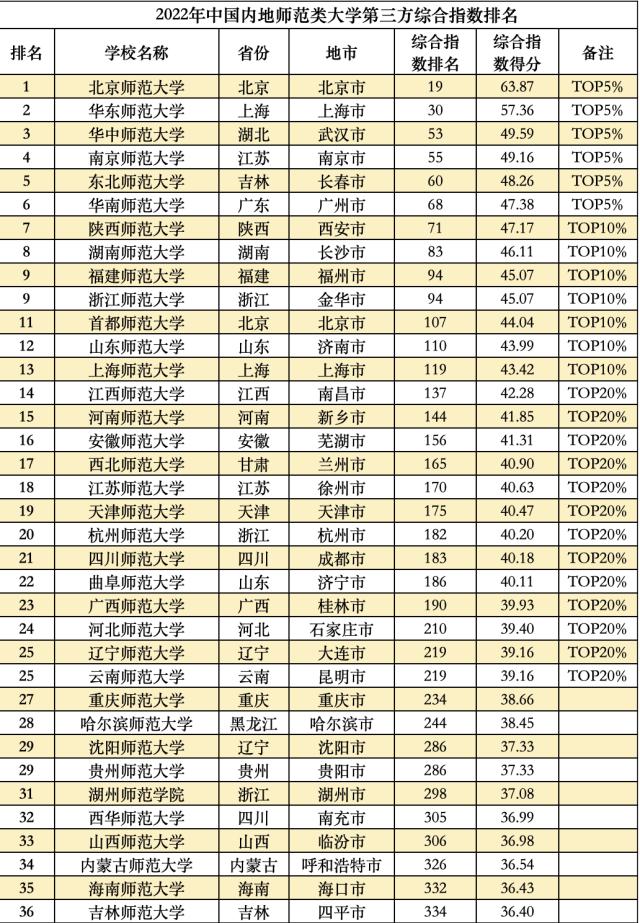 2022年共计129所师范类大学入选大学第三方综合指数排名,其中有26所高校进入师范类院校TOP20%。这26所师范类院校分布于中国内地的21个省份,其中北京、江苏、山东、上海、浙江分别拥有2所,各占比7.69%(2/26)。