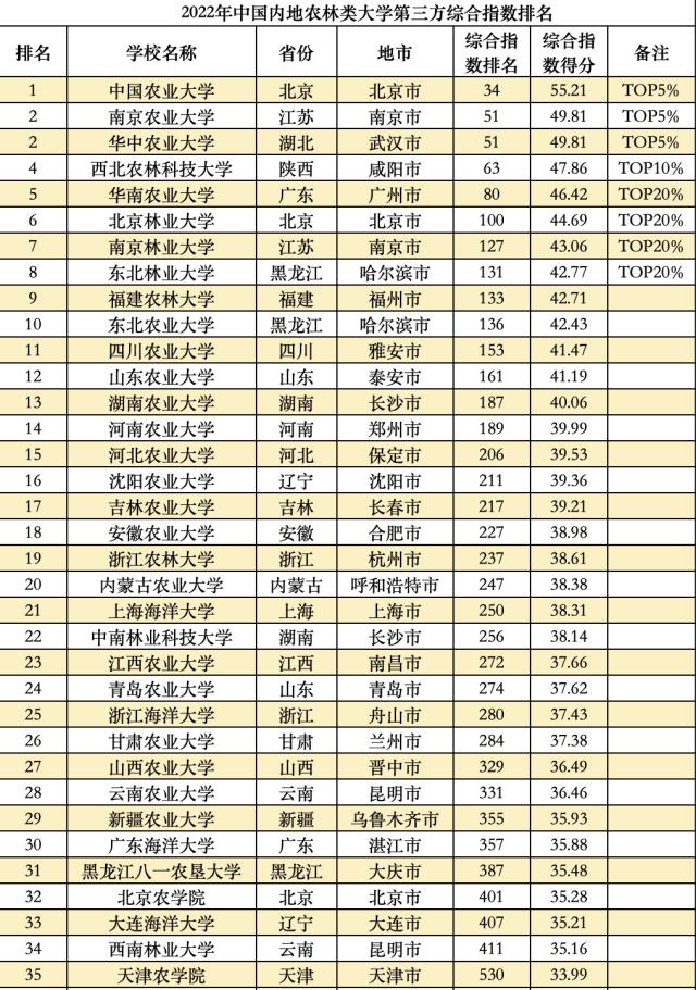 2022年共计40所农林类大学入选大学第三方综合指数排名,其中有8所高校进入农林类院校TOP20%,这8所农林类院校分布于中国内地的6个省份。其中,北京和江苏分别拥有2所,各占比25.00%(2/8)。