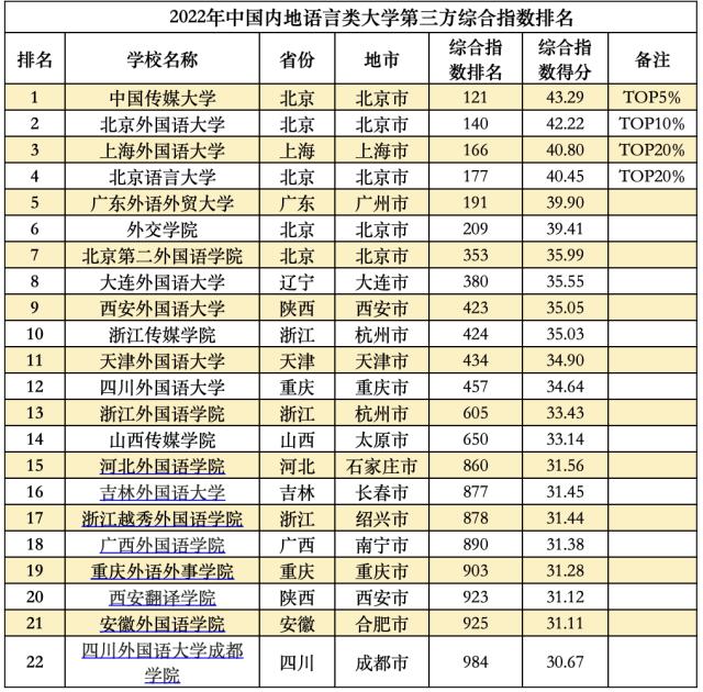 2022年共计22所语言类大学入选大学第三方综合指数排名,其中有4所高校进入语言类院校TOP20%,这4所语言类院校分布在北京和上海,其中北京拥有3所、上海拥有1所。