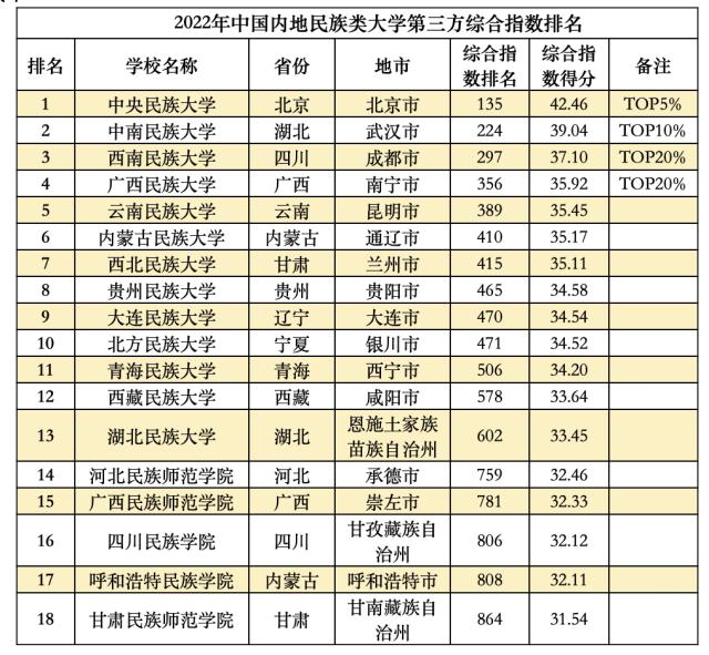 2022年共计18所民族类大学入选大学第三方综合指数排名,其中有4所高校进入民族类院校TOP20%,这4所民族类院校分布在北京、湖北、四川和广西4个省份。