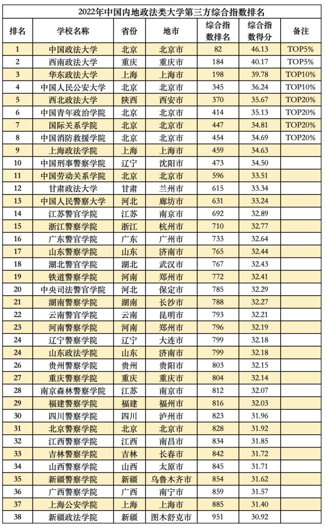 2022年共计38所政法类大学入选大学第三方综合指数排名,其中有8所高校进入政法类院校TOP20%,这8所政法类院校分布在北京、陕西、重庆和上海4个省份。