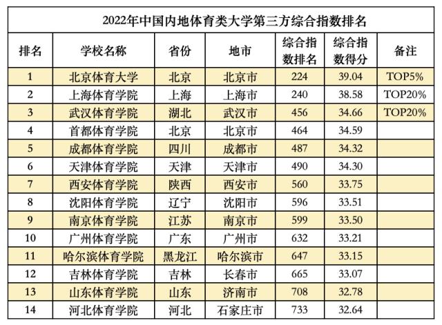 2022年共计14所体育类大学入选大学第三方综合指数排名,其中有3所高校进入体育类院校TOP20%,这3所体育类院校分布在北京、上海和湖北3个省份。