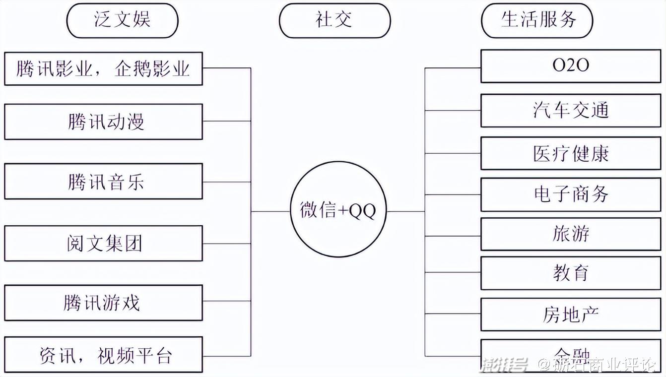 在专注于发展商业生态系统,以健康的生态系统充分连接、渗透、广泛服务于消费者和企业以及各类组织,并使自身获得优异的绩效和快速的成长方面,腾讯公司应当是代表性企业之一。成立于1998年的腾讯(Tencent),从最初推出QQ开始产品和服务的多元化扩张,到2011年推出微信后,战略方向有一个质变,即从产品的多元化向“连接一切”的愿景发展,将不具备领先优势的搜索、电商、O2O(线上到线下)以及小的业务砍掉,逐步明确以“社交”为连接,建设“泛娱乐+生活”的生态系统,吸引更多的合作伙伴加入,与合作伙伴共赢。腾讯的生态布局如图所示。