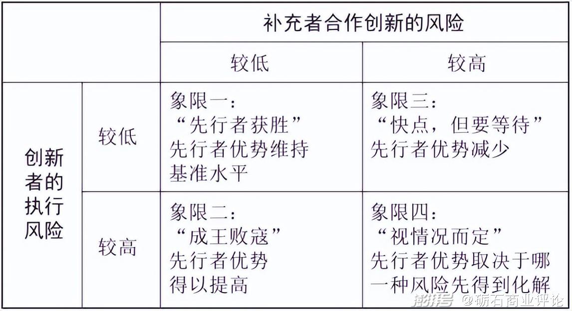 在创新的执行风险较低,同时合作创新风险也较低的情况下(象限一)中,先行者享有明显的优势,这种情况下,新产品一旦推向市场,合作创新就会迅速跟随。当创新的执行风险较高,也就是产品创新难度较大,而合作风险较低时(象限二),也就是合作者——内容提供商、配件供应商、分销商、维修服务商等——的进入门槛较低时,先行者则会获得一个更加明显的优势。对应“低执行风险/高合作风险”的情形(象限三),在这个场景下,以产品先发为基础的逻辑,在缺乏生态系统合作者同步创新的情况下停滞不前,在这里,第一个克服了其执行风险的公司不得不等待,眼看着丧失宝贵的入市先机。当创新风险与合作风险均较高时,回报速度会较低——这是该有警惕和耐心的时候,是做出积极准备的时候,但不是咄咄逼人地推出新产品的时候。