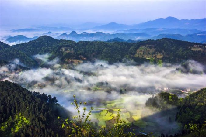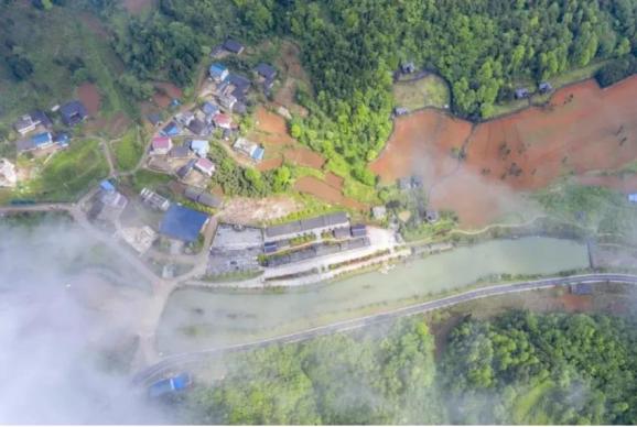 走进岑巩县天马镇苗落村,朦胧的远山笼罩着一层轻纱,山村于云雾中若隐若现,宛如仙境。