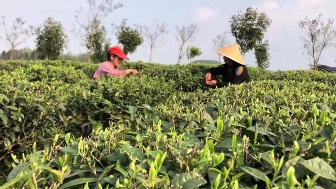 苗落村的茶园里,每天都有数百人穿梭在茶园之中采摘鲜叶。漫山遍野的茶树错落有致,抽芽吐绿,微风轻拂,激起层层绿浪,茶香四溢。