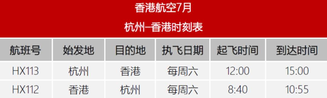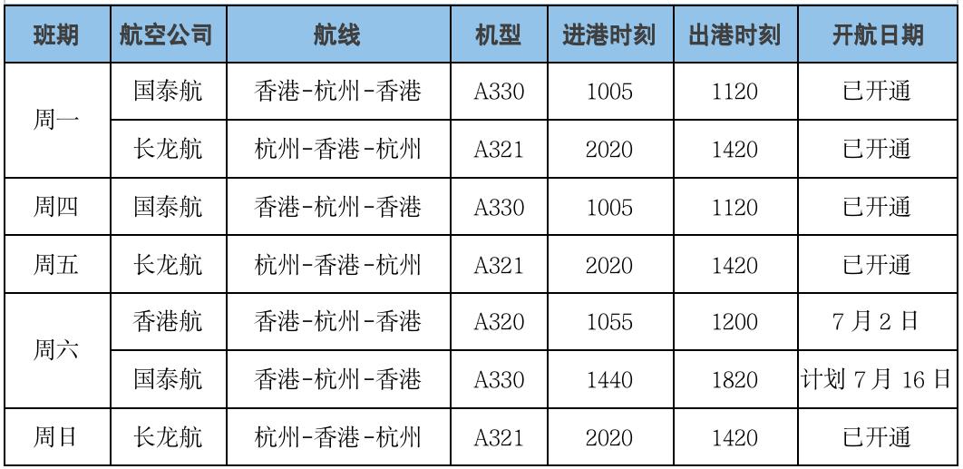 长龙航空于6月27日开通杭州=香港航线,每周一、五、日执行。国泰航空计划自7月16日起将航班加密至每周一、四、六执行。届时,杭州与香港之间的航线将达到每周7班,平均每天1班。