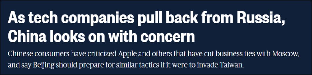 在NBC的这篇报道中,也特意提及了苹果退出俄罗斯所采取的措施,并在字里行间试图营造出“台海冲突出现后,中国也会遭遇类似情况”的氛围。