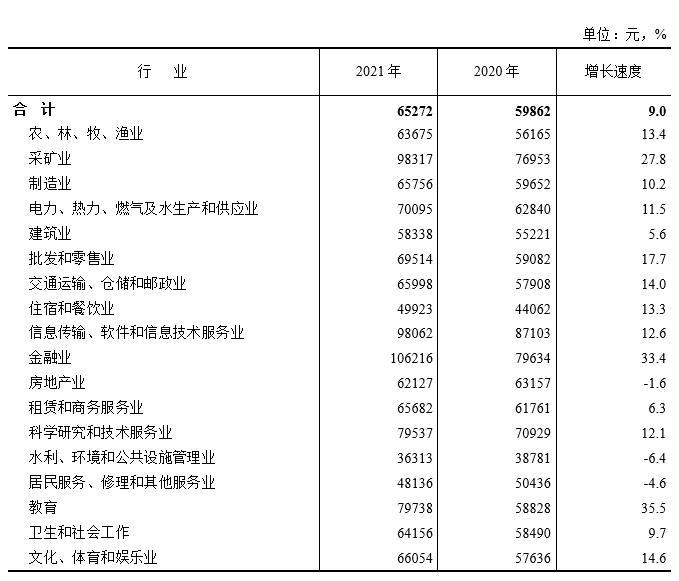 从增长速度看,年平均工资增速最高的3个行业依次为教育,金融业,采矿业,分别增长35.5%、33.4%和27.8%。增速最低的3个行业依次为水利、环境和公共设施管理业,居民服务、修理和其他服务业,房地产业,分别下降6.4%、4.6%和1.6%。