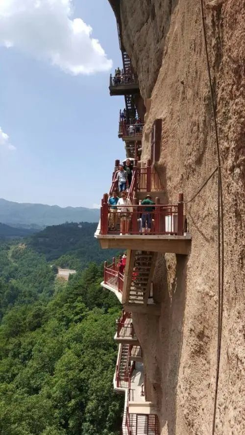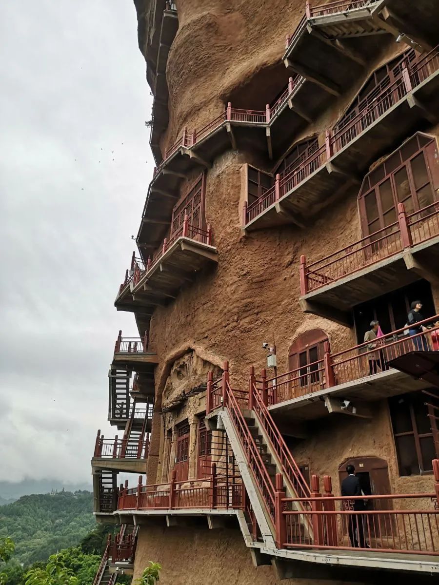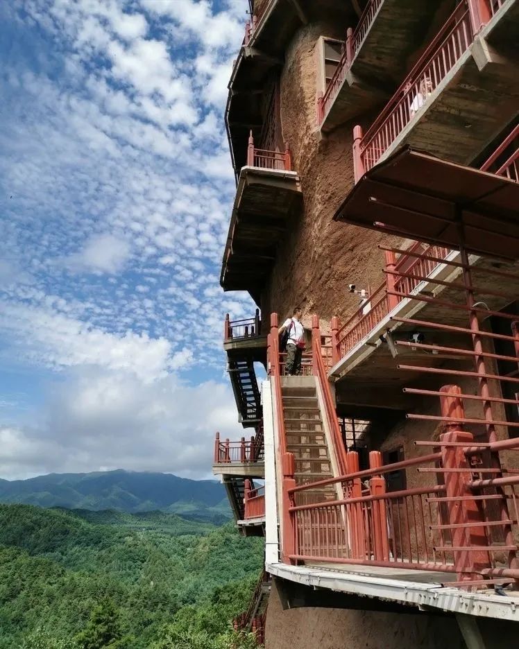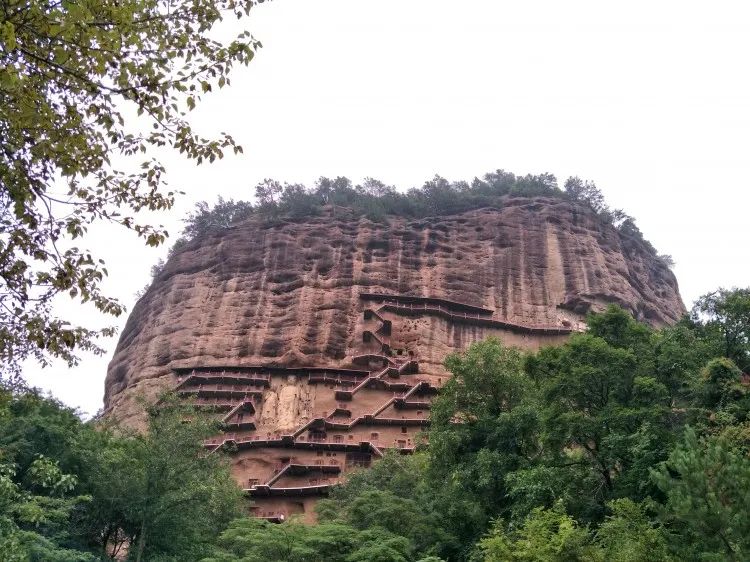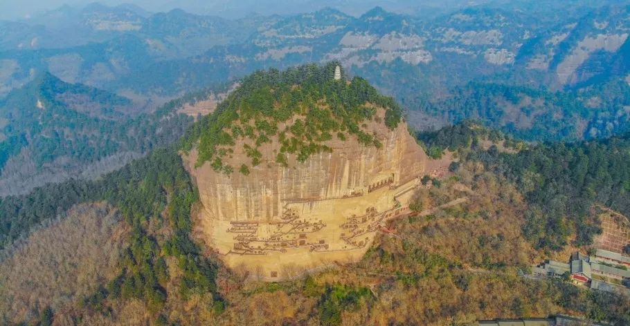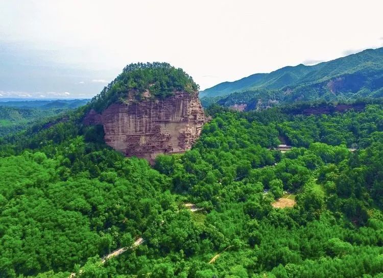 石窟所在的麦积山,是一座岩壁陡峭、绿植环抱的孤山,