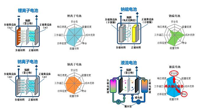 与锂电池、钠电池、钠硫电池相比,液流电池的优势在于安全性高、寿命长。
