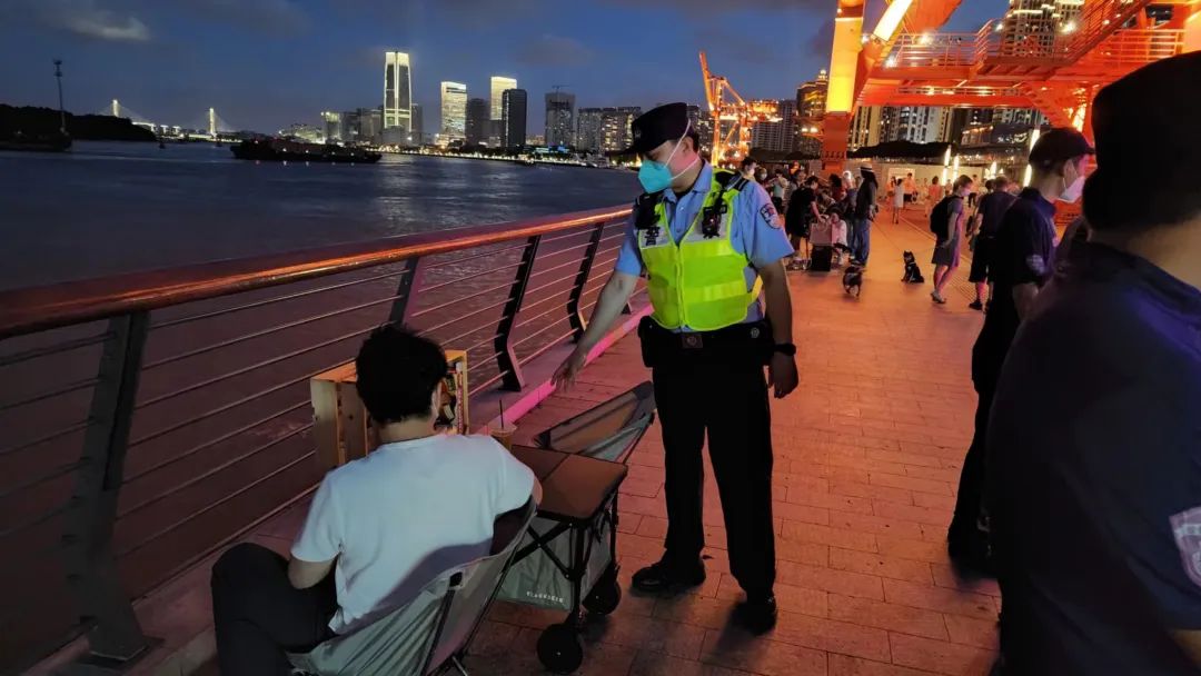 为此,徐汇警方设立滨江公共区域管控工作现场指挥部,实时关注区域人员聚集数量。在大客流预警到来时,对道路、非机动车道上行驶的机动车,以及共享单车、电动自行车、自行车等非机动车予以劝离,禁止机动车在管控区域内违法停放;会同滨江管理方对公共开放区域加强管理,要求市民落实不举办各类形式的文体活动,不设帐篷、不聚餐、不饮酒,不扎堆、不聚集,不露宿开放空间的区域管理规定;督促市民保持两米以上社交距离,严禁放飞无人机。其他增援警力根据岗位职责任务,配合交警和派出所做好治安、交通管控工作。