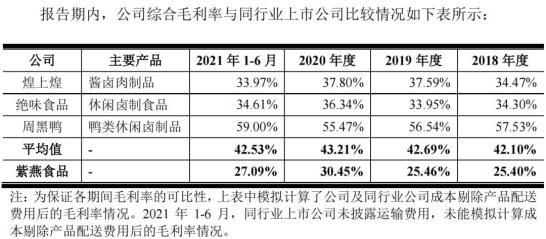 事实的确如此。据招股书,2018~2021上半年,紫燕食品的综合毛利率分别为25.40%、25.46%、30.45%和27.09%,相比之下,同行业公司的综合毛利率则分别为42.10%、42.69%、43.21%和42.53%。