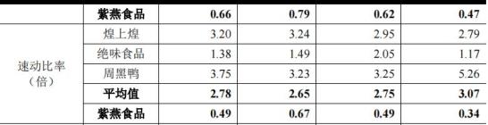 2018~2021上半年,紫燕食品的流动比率分别为0.47、0.62、0.79和0.66,速动比率分别为0.34、0.49、0.67和0.49。相比之下,同时段内,公司同行业上市公司的平均流动比率分别为4.01、3.67、3.68和3.51,平均速动比率则分别3.07、2.75、2.65和2.78。