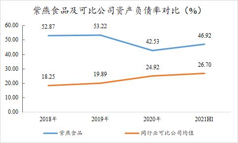 而就长期偿债能力来看,截至2021上半年末,紫燕食品的资产负债率也已经高达46.92%,其可比公司的资产负债率均值则仅为26.70%。