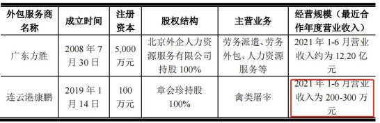 蹊跷的是,连云港康鹏成立于2019年,也就是说,在成立当年,它就成了紫燕食品唯二两家外包公司中的一家。而且,在2021年上半年,公司总营收仅200~300万元,而它承包紫燕食品活鸡屠宰业务带来的销售额则为235.02万元。