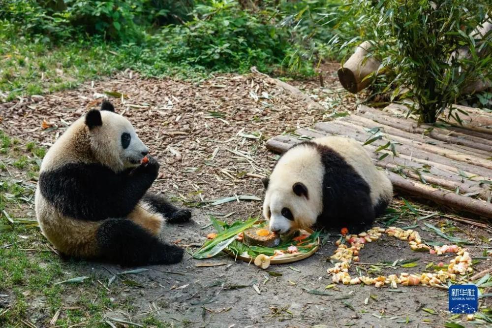 7月4日,在成都大熊猫繁育研究基地幼年大熊猫别墅,大熊猫“和花”与“和叶”在享用特制的生日蛋糕及苹果。这两只大熊猫是出生于2020年7月4日的一对龙凤胎姐弟。