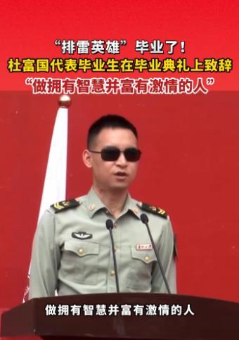 近日,贵州大学举行毕业典礼。有一位毕业生的发言令网友直呼“太励志”,他就是“排雷英雄战士”杜富国。2015年6月,杜富国主动请缨参加中越边境扫雷任务。2018年10月11日,在云南麻栗坡县进行排雷作业时,面对一枚局部露出地面的加重手榴弹,27岁的杜富国对战友喊出“你退后,让我来”。在进一步查明情况时突遇爆炸,生死瞬间,他扑向战友一侧,遮挡住爆炸冲击波和弹片。这一挡,令他永远失去了双眼和双手。2019年,杜富国被授予“排雷英雄战士”荣誉称号。2022年,杜富国获得“八一勋章”提名。