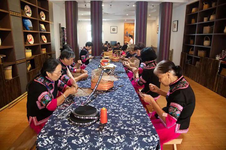 沐尘畲族乡“文创体验馆”内,村民正在编制传统手工艺品