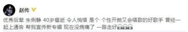 在家人证实死讯后,音乐人赵传发文悼念,赞朱俐静是“优秀的后辈” ,“现在没病痛了,一路走好。”也有歌迷哀悼称,“天妒英才,好可惜,希望天堂能够没有病痛!”