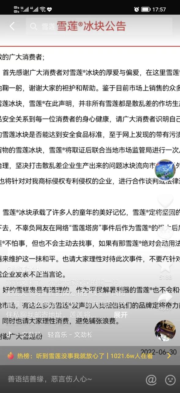 “雪莲冰块”官方号在辟谣的时候发布公告表示,目前市场上销售的众多商标雪莲冰块,并非所有都是散乱差的作坊生产,请广大消费者识明自己当地的雪莲冰块是否能达到安全食品标准。雪莲将追诉商标侵权的企业。