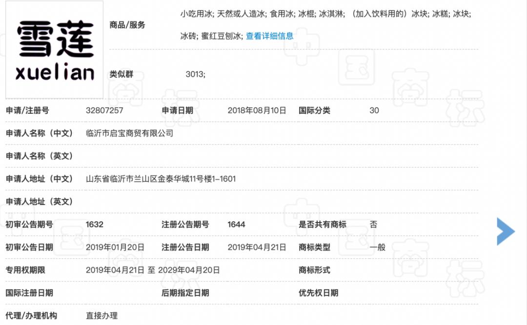 而据天眼查,古椹斋食品并没有“雪莲”或“雪莲冰块”字样的商标权,而是其股东临沂市启宝商贸有限公司(以下简称“临沂启宝”)有“雪莲”中文与拼音的商标。