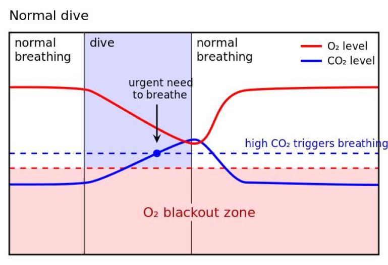 ▲正常情况下,憋气(蓝色区间)时间越久,血液中氧气(红色)浓度越低,而二氧化碳(蓝色)浓度越高,二氧化碳的高浓度促发呼吸反射。图片来源:wikiwand